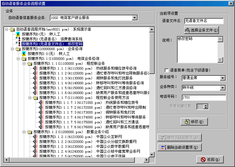。。編制成功的業(yè)務(wù)流程由業(yè)務(wù)處理點在線加載執(zhí)行,保證系統(tǒng)功能的動態(tài)擴充。可在線加載自動業(yè)務(wù),多種自動業(yè)務(wù)在動態(tài)加載時,為不影響正在處理的呼叫,可多版本運行,舊版本業(yè)務(wù)的呼叫處理全部結(jié)束后,舊版本業(yè)務(wù)自動升級。