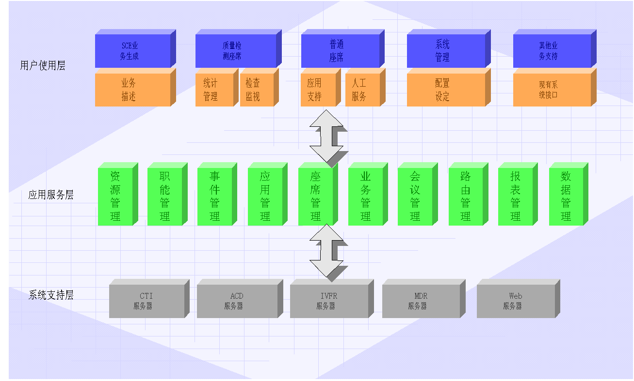 采用功能分散,統(tǒng)一管理的設(shè)計模式。各組件功能相對獨立,分布式處理各項事務(wù),它們的有機結(jié)合實現(xiàn)了功能完善的ACD服務(wù)器。各組件的預留接口提供了功能擴充的有效途徑。功能包括: