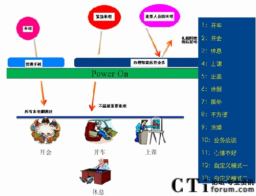 智能應(yīng)答業(yè)務(wù)是針對消費者不便通話時的一個增值業(yè)務(wù)。當(dāng)被叫用戶有來電時,因為自己的原因不便通話而掛斷電話后通過手機彈出的菜單,供用戶選擇與對方進(jìn)行的后續(xù)溝通。被叫用戶可以根據(jù)所處的情況選擇對應(yīng)的情景,系統(tǒng)將根據(jù)用戶選擇的情景對應(yīng)給主叫用戶發(fā)送短信和放音。智能應(yīng)答業(yè)務(wù)給了我們禮貌拒接的機會。當(dāng)您正在會議室里和客戶如火如荼的策劃下個項目,當(dāng)然不想被其他人打擾。突然有個電話打了進(jìn)來,接還是不接,不接有可能是一個潛在的客戶,接了又是對目前工作的一種打斷。如果你辦理了智能應(yīng)答業(yè)務(wù),當(dāng)你掛斷電話的同時手機上將出現(xiàn)一個菜單,你可以根據(jù)當(dāng)前具體情況選擇目前所處的情景(開車、開會、上課……等)。如你選擇了某種情景,系統(tǒng)將根據(jù)用戶選擇的情景,給主叫用戶播放相應(yīng)的語音通知(如:“您撥叫的用戶正在開會,請稍后再撥”)。
