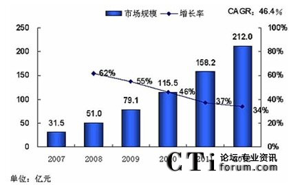 再來看看統(tǒng)一市場的前景,下圖是某咨詢公司對國內統(tǒng)一通信市場的預測數(shù)據(jù),2012年將達到212億元,盡管可能存在一定水份,但這么多公司介入這個市場,本身就體現(xiàn)了發(fā)展?jié)摿,這點不容懷疑。
