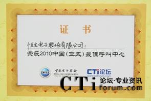 CTI論壇(ctiforum)10月14日消息(記者 潘婷婷):2010年9月28日,恒生通信應(yīng)邀出席由中國電子商會(huì)呼叫中心與客戶關(guān)系管理專業(yè)委員會(huì)(CNCCA)主辦,國家工業(yè)和信息化部支持,CTI論壇承辦的2010中國呼叫中心產(chǎn)業(yè)峰會(huì)。憑借在中國呼叫中心領(lǐng)域技術(shù)及市場的領(lǐng)先地位,恒生通信榮獲中國電大會(huì)組委會(huì)頒發(fā)的中國(亞太)最佳呼叫中心供應(yīng)商大獎(jiǎng)。這已是恒生通信自2007年來連續(xù)第四年獲此殊榮。
