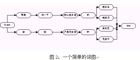 在語音識別中,語言模型是用來指導(dǎo)引擎進(jìn)行語音識別的,它限定了一個(gè)識別引擎所能表達(dá)的語句類型。在我們常用的圖搜索引擎中,語言模型是通過語法來表示的,語法是由一系列表示某個(gè)領(lǐng)域的語言表達(dá)方式的規(guī)則組成的(語法的具體書寫規(guī)則見引擎使用說明書)。這些規(guī)則會(huì)被被轉(zhuǎn)換成詞圖的形式然后用來指導(dǎo)語音的識別。所謂的詞圖是指由詞作為節(jié)點(diǎn)的一個(gè)圖,從該圖的開始節(jié)點(diǎn)到末尾節(jié)點(diǎn)的任一條路徑都是一個(gè)有效合法的句子。圖2給出了一個(gè)簡單的詞圖。