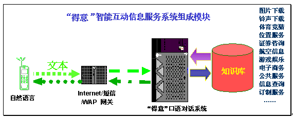 在現(xiàn)有的數(shù)據(jù)通信和信息服務(wù)的技術(shù)平臺上,加入"得意口語對話系統(tǒng)運行平臺",就能夠讓用戶在通過Internet/SMS/WAP等各種通信手段,在電腦、手機等設(shè)備上以自然語言的形式享受相關(guān)領(lǐng)域的智能互動信息服務(wù)。