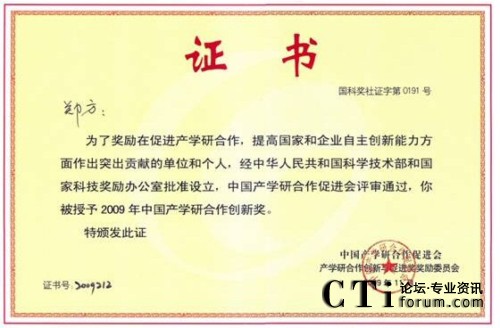CTI論壇(ctiforum)11月26日消息(記者 潘婷):2009年11月7日,得意公司董事長鄭方博士獲中國產(chǎn)學(xué)研合作促進(jìn)會(huì)2009年度中國產(chǎn)學(xué)研合作創(chuàng)新獎(jiǎng)。該獎(jiǎng)勵(lì)是面向國內(nèi)在促進(jìn)產(chǎn)學(xué)研合作及創(chuàng)新方面做出突出貢獻(xiàn)的單位及個(gè)人所頒發(fā)的年度榮譽(yù)獎(jiǎng)。