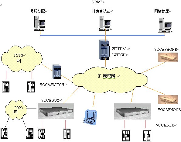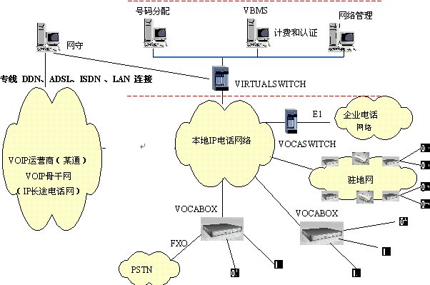 本方案中,企業(yè)電話網(wǎng)絡(luò)或者駐地網(wǎng)客戶的電話網(wǎng)絡(luò)作為大客戶通過IP方式或者通過VOCASWITH的E1端口接入到本地電話接入網(wǎng)絡(luò)。安裝VIRTUALSWITCH網(wǎng)關(guān)代理系統(tǒng),它作為整個本地電話接入網(wǎng)絡(luò)的網(wǎng)守(GATEKEEPER),以集中方式管理域內(nèi)的所有網(wǎng)關(guān)(VOCA-BOX)。