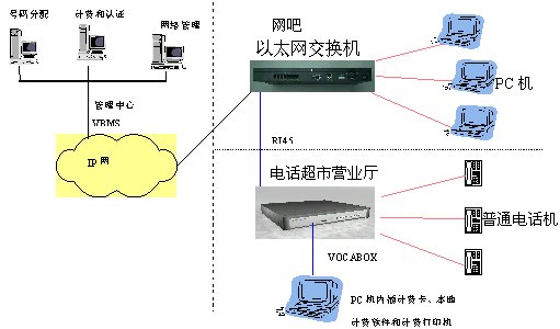 此方案的特點是將電話終端深入到公用電話的超市,用戶可以撥打IP長途電話、PSTN普通電話用戶及移動電話用戶,并在用戶端通過VOCA-BOX語音網(wǎng)關(guān)、計費卡和計費軟件實現(xiàn)本地營業(yè)廳立即計費的要求。在運營商的管理中心通過配置VBMS系統(tǒng)實現(xiàn)后臺集中計費認(rèn)證功能,用于管理各個營業(yè)中心的VOCA-BOX語音網(wǎng)關(guān),各營業(yè)中心的VOCA-BOX語音網(wǎng)關(guān)提供認(rèn)證計費信息給VBMS,計費類型可按實際的需求配置如:預(yù)付費、后付費等。此方案可以擴大ISP及寬帶網(wǎng)絡(luò)運營商的業(yè)務(wù)市場,增加ISP及寬帶網(wǎng)絡(luò)運營商的收益。