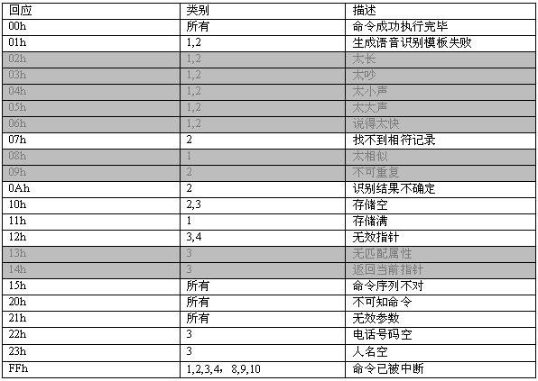 命令描述: 訓(xùn)練一個(gè)名字。當(dāng)增加一條電話(huà)本記錄時(shí),應(yīng)先執(zhí)行此命令。該命令會(huì)生成一個(gè)語(yǔ)音模板,同時(shí)產(chǎn)生一個(gè)長(zhǎng)達(dá)2秒的名字錄音。在此命令成功執(zhí)行之后,MCPU接著發(fā)送06h命令增加電話(huà)號(hào)碼。如果沒(méi)有執(zhí)行06h命令,則該項(xiàng)記錄電話(huà)號(hào)碼為空。