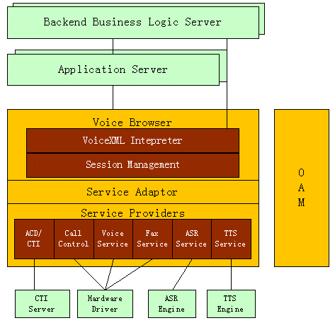 用于存放和產(chǎn)生VoiceXML腳本,可以是文件系統(tǒng)或WEB服務(wù)器,一般文件系統(tǒng)應(yīng)用于靜態(tài)腳本,WEB服務(wù)器應(yīng)用于動(dòng)態(tài)腳本;應(yīng)用邏輯組件或中間件,進(jìn)行事務(wù)處理。
