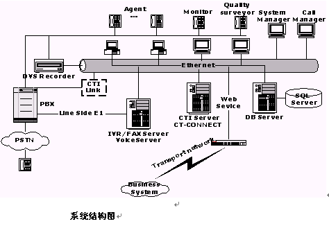 交換機實現(xiàn)電話呼入、呼出功能;還需要提供自動排隊機系統(tǒng),用于實現(xiàn)對來話的均衡分配;呼叫管理系統(tǒng),用于有效管理所有話務(wù);支持IVR;提供CTI Link模塊作為計算機/電話集成接口;同時,交換機還可作為辦公電話交換機使用,系統(tǒng)可支持多家公司的交換機。