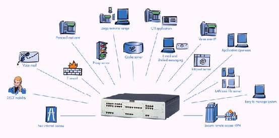- 一體化:將多項功能集成到一個單一設(shè)備中,這些包括:因特網(wǎng)接入、E-mail服務(wù)器、局域網(wǎng)、計算機電話集成(CTI)、呼叫管理(嵌入式個人助理及語音信箱,內(nèi)部移動通信等)。