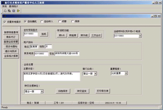 本系統(tǒng)將為旅行社提供強(qiáng)勁的客戶關(guān)系管理能力,自動(dòng)業(yè)務(wù)導(dǎo)航能力,交互式協(xié)作能力,并可通過基于各業(yè)務(wù)代表技能特點(diǎn)的路由選擇,將客戶來話接到最符合要求的業(yè)務(wù)代表處,對(duì)于老客戶還可以建立一對(duì)一的關(guān)系,將老客戶的來話直接接到以前曾與之通過話的業(yè)務(wù)人員處,使其倍感親切。
