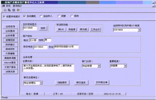 。。接通呼叫中心的電話后,按語音提示選擇相應(yīng)的服務(wù),選擇相應(yīng)的服務(wù)功能鍵后,在服務(wù)人員的計算機屏幕上自動彈出對話框顯示用戶的詳細信息。