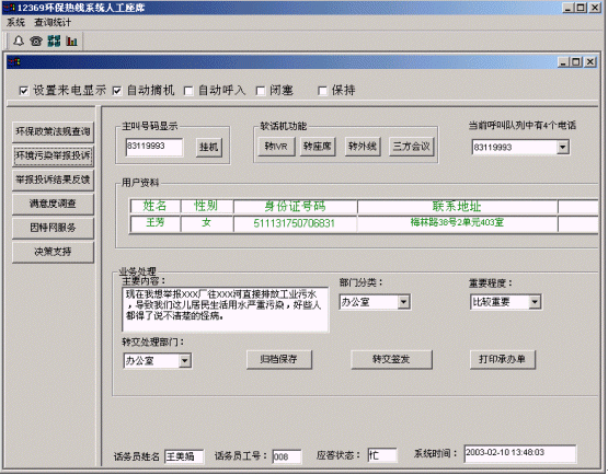 12369環(huán)保熱線(xiàn)系統(tǒng)將接入功能、導(dǎo)航功能、自動(dòng)語(yǔ)音查詢(xún)功能、人工座席服務(wù)功能、話(huà)路轉(zhuǎn)接功能、信息資料處理緊密聯(lián)系起來(lái)。用戶(hù)撥打特服電話(huà)號(hào)碼后,可以根據(jù)需要選擇人工服務(wù)、自動(dòng)語(yǔ)音查詢(xún)、自動(dòng)留言,并能夠在幾種服務(wù)中來(lái)回切換或轉(zhuǎn)接其它電話(huà);所記錄的資料可以分門(mén)別類(lèi)的進(jìn)行統(tǒng)計(jì)并形成報(bào)表,供相關(guān)部門(mén)進(jìn)行檢索查閱;意見(jiàn)處理完畢,可由座席主動(dòng)呼叫用戶(hù),告知處理意見(jiàn),形成閉環(huán)處理流程。