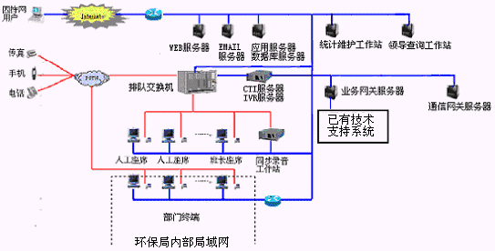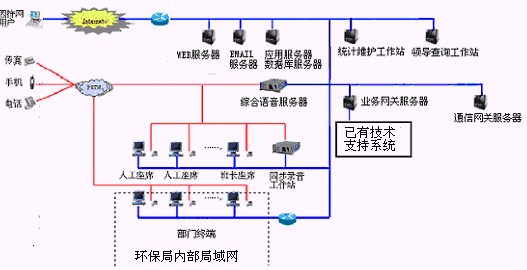 該12369環(huán)保熱線(xiàn)系統(tǒng)主要是由具有排隊(duì)功能的交換機(jī)或帶語(yǔ)音板卡的工控機(jī)、CTI服務(wù)器、IVR(交互式語(yǔ)音應(yīng)答)/IFR(交互式傳真應(yīng)答)子系統(tǒng)、人工座席子系統(tǒng)、應(yīng)用服務(wù)器、數(shù)據(jù)庫(kù)服務(wù)器、業(yè)務(wù)網(wǎng)關(guān)子系統(tǒng)、通信網(wǎng)關(guān)子系統(tǒng)等硬件設(shè)備和應(yīng)用軟件組成。