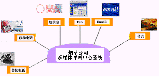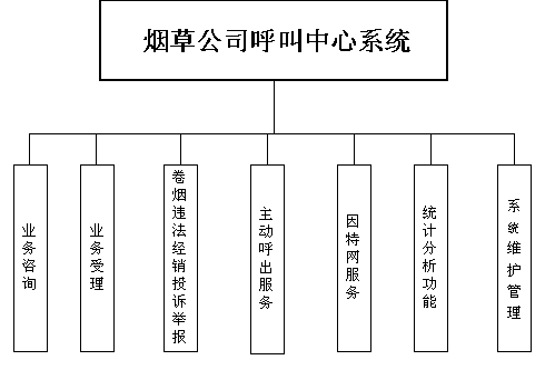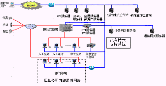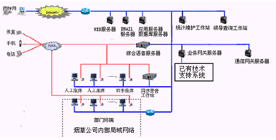 卷煙經(jīng)銷戶等客戶利用電話、傳真、電子郵件、因特網(wǎng)、手機(jī)、短消息等撥打統(tǒng)一的特服號碼(如800XXX或9XXXX)進(jìn)入煙草公司呼叫中心,本系統(tǒng)依托煙草公司各類業(yè)務(wù)技術(shù)支持系統(tǒng)和網(wǎng)絡(luò)系統(tǒng),實現(xiàn)煙草專賣局原有管理系統(tǒng)/業(yè)務(wù)系統(tǒng)及數(shù)據(jù)庫的無縫連接,通過人工受理或自動語音服務(wù)等方式全天24小時不間斷地為客戶提供各種服務(wù)。