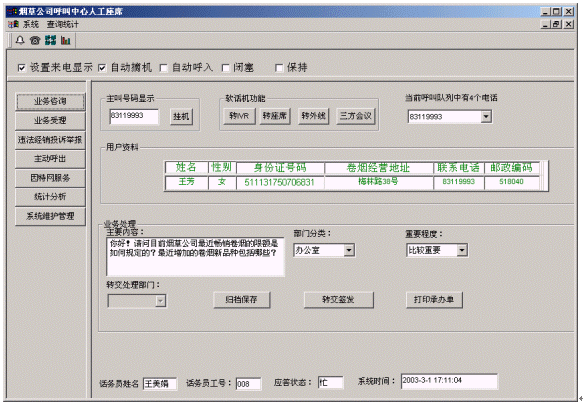 煙草公司呼叫中心將接入功能、導(dǎo)航功能、自動語音查詢功能、人工座席服務(wù)功能、話路轉(zhuǎn)接功能、信息資料處理緊密聯(lián)系起來。用戶撥打特服電話號碼后,可以根據(jù)需要選擇人工服務(wù)、自動語音查詢、自動留言,并能夠在幾種服務(wù)中來回切換或轉(zhuǎn)接其它電話;所記錄的資料可以分門別類的進(jìn)行統(tǒng)計并形成報表,供相關(guān)部門進(jìn)行檢索查閱;意見處理完畢,可由座席主動呼叫用戶,告知處理意見,形成閉環(huán)處理流程。