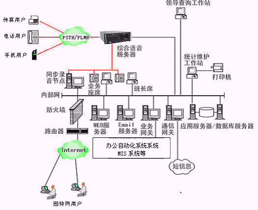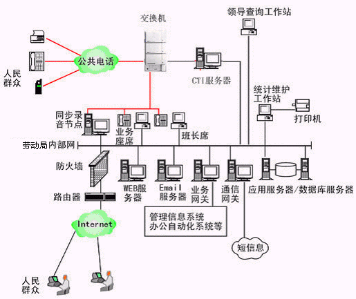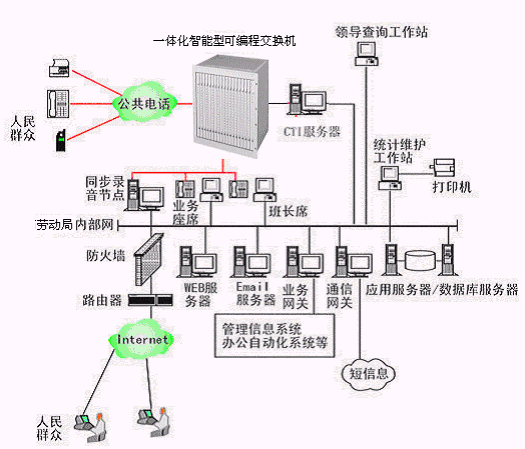 勞動局多媒體呼叫中心系統(tǒng)主要是由智能型可編程交換機或帶語音板卡的工控機或排隊交換機、CTI服務器、IVR(交互式語音應答)/IFR(交互式傳真應答)子系統(tǒng)、人工座席子系統(tǒng)、應用服務器、數(shù)據(jù)庫服務器、業(yè)務網(wǎng)關(guān)子系統(tǒng)、WEB服務器、電子郵件服務器、防火墻、通信網(wǎng)關(guān)等硬件設備和應用軟件組成。