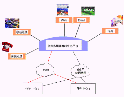 客戶利用電話、傳真、電子郵件、因特網(wǎng)、手機(jī)、短消息等進(jìn)入城市公共多媒體呼叫中心平臺(tái),本系統(tǒng)依托現(xiàn)有各專業(yè)呼叫中心/使用城市公共多媒體呼叫中心平臺(tái)租賃服務(wù)的企事業(yè)單位的各類業(yè)務(wù)技術(shù)支持系統(tǒng)和網(wǎng)絡(luò)系統(tǒng),通過人工受理或自動(dòng)語音服務(wù)等方式全天24小時(shí)不間斷地為客戶提供各種服務(wù)。