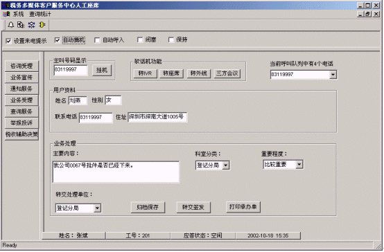 | 支持彈屏功能 | 支持無論客戶采用何種呼叫類型(電話、短消息、網(wǎng)上呼叫),客戶信息在座席界面都可自動彈出。 |