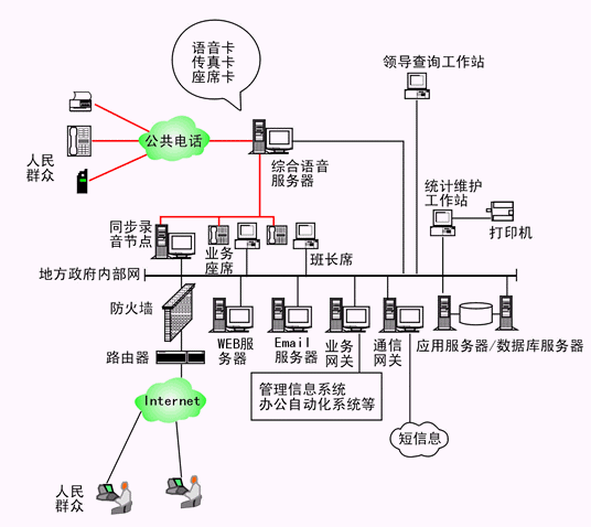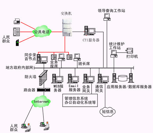 本系統(tǒng)物理結(jié)構(gòu)由帶語(yǔ)音板卡的工控機(jī)或排隊(duì)交換機(jī)、座席分流器、CTI服務(wù)器、IVR(交互式語(yǔ)音應(yīng)答)/IFR(交互式傳真應(yīng)答)服務(wù)器、業(yè)務(wù)代表座席、班長(zhǎng)座席、統(tǒng)計(jì)維護(hù)管理工作站、因特網(wǎng)(WEB)服務(wù)器、電子郵件(EMAIL)服務(wù)器、數(shù)據(jù)庫(kù)/應(yīng)用服務(wù)器、業(yè)務(wù)網(wǎng)關(guān)服務(wù)器、錄音留言工作站、領(lǐng)導(dǎo)查詢(xún)工作站、網(wǎng)絡(luò)系統(tǒng)等構(gòu)成。