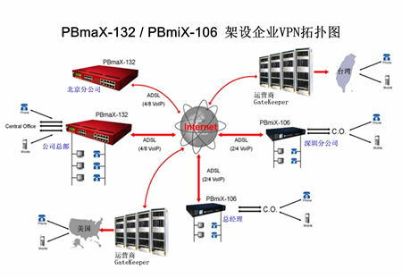 對(duì)于具有多個(gè)分支機(jī)構(gòu)的公司,PBmaX/PBmiX系列IP-PBX能夠通過(guò)內(nèi)建的VoIP通道將各分支機(jī)構(gòu)連接起來(lái)。使撥打遠(yuǎn)程分機(jī)如同撥打本地分機(jī) 一樣簡(jiǎn)單,且無(wú)需支付任何長(zhǎng)話費(fèi)用。