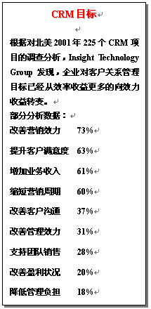 3.對于客戶關系管理工作的總體目標有明確的設定,并可據此逐步分解到效益收益、客戶管理、業(yè)務運營、組織人員和信息技術等具體客戶關系管理目標;