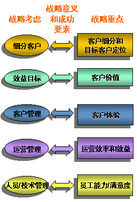 客戶關系管理戰(zhàn)略一般由以下5個部分的戰(zhàn)略考慮和相關的戰(zhàn)略重點構成: