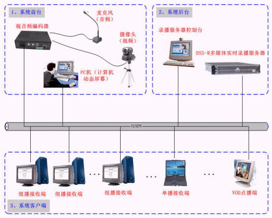 可通過(guò)單播或多播方式將現(xiàn)場(chǎng)的視頻、音頻、計(jì)算機(jī)動(dòng)態(tài)屏幕在網(wǎng)絡(luò)上進(jìn)行直播,客戶(hù)端可通過(guò)直播接收軟件接收到視頻、音頻、計(jì)算機(jī)動(dòng)態(tài)屏幕信息,采用組播方式時(shí)接收端數(shù)據(jù)沒(méi)有限制,可以在遠(yuǎn)程完整再現(xiàn)會(huì)場(chǎng)或教室的實(shí)況。