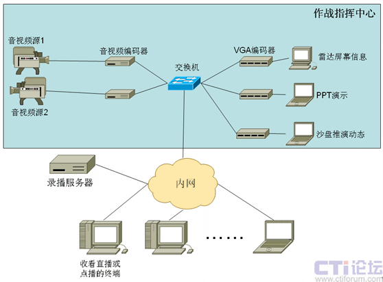 在軍隊(duì)系統(tǒng)中比較典型的應(yīng)用是軍隊(duì)作戰(zhàn)演習(xí)的錄播。軍隊(duì)中常會(huì)進(jìn)行軍事演習(xí)、網(wǎng)上模擬對抗訓(xùn)練,以此來增強(qiáng)現(xiàn)代化軍隊(duì)的作戰(zhàn)能力,演習(xí)指揮部在作戰(zhàn)指揮中心通過大屏等顯示設(shè)備全盤了解對抗雙方動(dòng)態(tài),以往缺乏有效的演習(xí)記錄手段,不利于事后分析及總結(jié)經(jīng)驗(yàn)教訓(xùn)。會(huì)易錄支持多路AV和VGA信號(hào)的同步組合錄制,可以把演習(xí)過程中作戰(zhàn)指揮中心顯示的信息進(jìn)行全面的錄制,如對抗雙方的視音頻信息、網(wǎng)上沙盤推演動(dòng)態(tài),雷達(dá)屏幕信息等內(nèi)容,同時(shí)也可以通過網(wǎng)絡(luò)將上述信息實(shí)時(shí)傳送給上級(jí)部門來進(jìn)行網(wǎng)上演習(xí)的在線觀摩。該錄播系統(tǒng)的典型框圖如下: