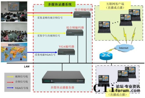 廣州市旅游職業(yè)學(xué)校多媒體錄播系統(tǒng)組網(wǎng)如上圖所示。在本項目中編碼器和多媒體錄播服務(wù)器分別部署在教室和機房內(nèi),前端的視音頻編碼器采集老師、學(xué)生的視音頻信號,VGA編碼器采集PPT內(nèi)容,編碼器采集信號并編碼后通過網(wǎng)絡(luò)發(fā)送給多媒體錄播服務(wù)器,多媒體錄播服務(wù)器接收并實現(xiàn)同步錄制、直播及事后點播。老師、學(xué)生可在教室、辦公室、宿舍等任何可以連接校園網(wǎng)的地方實時觀看教室內(nèi)進行的課程,可滿足日常多媒體教學(xué)、課件錄制、微格教學(xué)等應(yīng)用的需要。