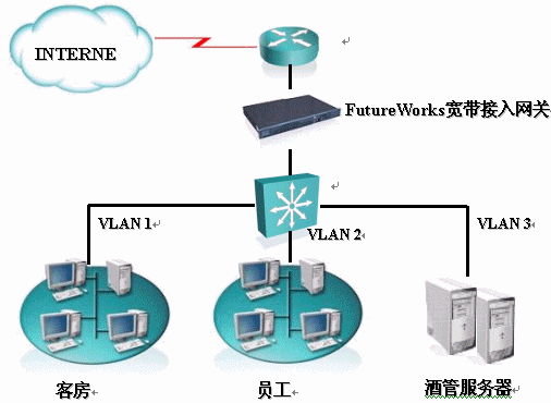 FutureWorks寬帶計(jì)費(fèi)系統(tǒng)針對(duì)南京大飯店上網(wǎng)計(jì)費(fèi)的解決方案結(jié)構(gòu)圖