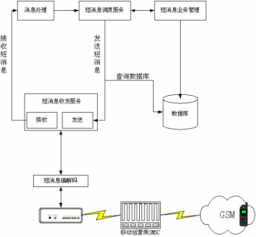用戶確定發(fā)送后經過發(fā)送函數調用底層的設備DLL,通過GSM-MODEM發(fā)送至運營商的短消息服務中心(SMSC),再轉發(fā)至接收地址的手機上,從而完成發(fā)送流程。