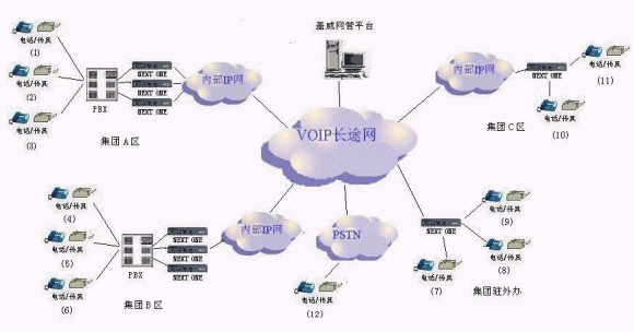 深圳市蓋威科技有限公司完整的語音解決方案如下,用一個(gè)網(wǎng)管平臺(AVS SERVER)來管理眾多企業(yè),各企業(yè)分支機(jī)構(gòu)間可以實(shí)現(xiàn)相互通話免話費(fèi),另外將企業(yè)內(nèi)部通話之外的電話通過網(wǎng)管平臺接入到電信營運(yùn)商的VoIP