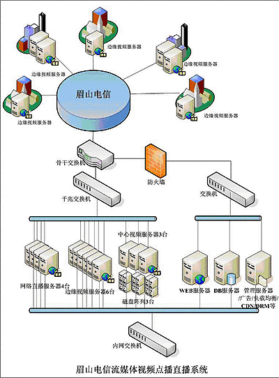 2004年10月隨著四川眉山電信公司寬帶網(wǎng)建設(shè)的日益完善和寬帶接入業(yè)務(wù)的迅速發(fā)展,公司原先擁有一套簡(jiǎn)單的流媒體服務(wù)系統(tǒng),從功能和性能上都不能滿足業(yè)務(wù)的需要,公司決定建設(shè)一套運(yùn)營(yíng)級(jí)的流媒體視頻服務(wù)系統(tǒng),提供3000個(gè)并發(fā)的視頻點(diǎn)播服務(wù)和8路的網(wǎng)絡(luò)電視直播、并提供DRM文件的加密下載。