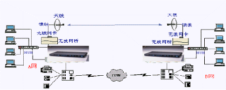 A網(wǎng)與B網(wǎng)分別為兩個局域網(wǎng),通過兩臺WavePoint II無線網(wǎng)橋?qū)蓚局域網(wǎng)連在一起,網(wǎng)橋上的RJ45口或BNC細(xì)纜接口與局域網(wǎng)相連。每臺網(wǎng)橋上插有一塊WaveLAN無線PC卡,PC卡的射頻輸出端口,通過饋線接到天線,通過PC卡來完成無線鏈路的連通。無線網(wǎng)橋連接完成后的效果類似HUB級連。IP語音網(wǎng)關(guān)-HGW-904的局域網(wǎng)接口(RJ45)連接到局域網(wǎng)的HUB上,根據(jù)用戶實際的話務(wù)量,選用Line端口接入用戶電話交換機(PBX),PBX接普通電話機和傳真機,并連接至電話公網(wǎng)(PSTN)。其中所需設(shè)備:HGW-904