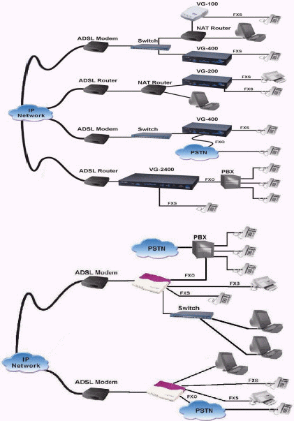 總部采用可堆疊的VG-2000,通過IP網(wǎng)絡(luò)(互聯(lián)網(wǎng))同各中心或分支機構(gòu)的相連,利用PBX(小型電話交換總機)的交換能力將話音自動轉(zhuǎn)到VG-2000上,通過數(shù)據(jù)專線、VPN或Internet傳輸。可以在VG-2000上進行流量控制(Bandwidth