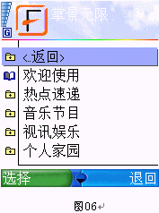 4.現(xiàn)在此軟件支持的媒體網(wǎng)站只有"掌景無(wú)限",估計(jì)以后隨著肥 6 用戶(hù)及在線視頻播放功能的普及,類(lèi)似的網(wǎng)站會(huì)更多,打開(kāi)"掌景無(wú)限",則系統(tǒng)會(huì)提示你所選擇的連接接入點(diǎn),