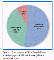 2002年第一季度,短信服務(wù)ARPU值占所有數(shù)據(jù)服務(wù)收入的19.1%,郵件服務(wù)占38%,而內(nèi)容下載服務(wù)則達(dá)到了53%。(信息來源:2002年9月J-Phone)