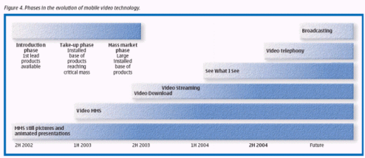 MMS正在步入一個(gè)高級(jí)功能發(fā)展階段,其中包括信息表達(dá)能力、視頻和內(nèi)容的保護(hù)能力。諾基亞認(rèn)為,由于用戶需要利用他們的個(gè)人移動(dòng)終端去采集和發(fā)送視頻信息,因此用戶需要移動(dòng)視頻服務(wù)。這種服務(wù)就是將用戶購買或免費(fèi)獲贈(zèng)的內(nèi)容發(fā)送的用戶的終端上。移動(dòng)用戶也可以通過其它途徑來觀看視頻節(jié)目,包括通過瀏覽器進(jìn)行視頻下載和流式播放。這兩種方式都有各自的優(yōu)點(diǎn),例如,視頻下載允許用戶選擇、本地存儲(chǔ)或回放視頻節(jié)目,而流式播放則可以讓用戶實(shí)時(shí)播放尺寸較大的視頻節(jié)目。