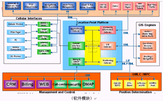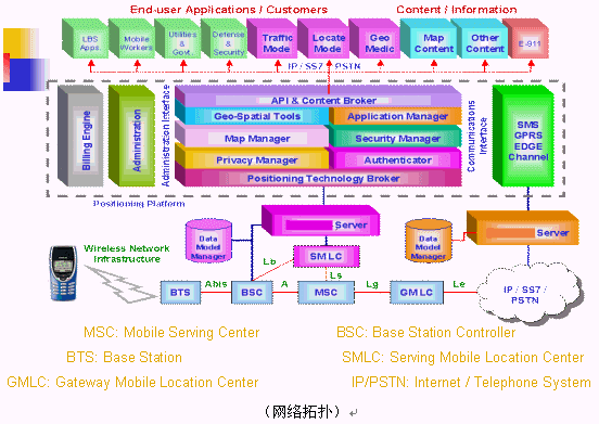 GeoMode定位技術(shù)的關(guān)鍵模塊由定位系統(tǒng)(SMLC/GMLC/STK+Server)、電子地圖信息系統(tǒng)(Map Manager)和增值服務應用系統(tǒng)(End-user