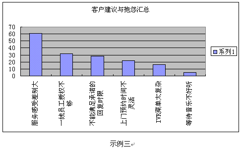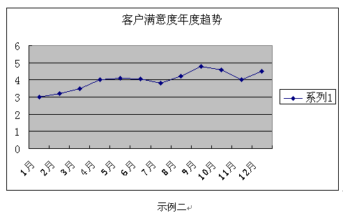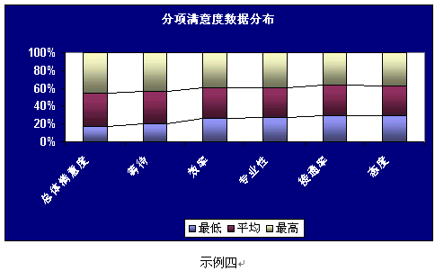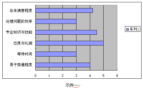 客戶滿意度調(diào)查的數(shù)據(jù)及分析結(jié)果應(yīng)該以一種易讀易解的方式呈現(xiàn)。圖表的形式總是比單純、枯燥的EXCEL表格和長篇大論更容易被人理解并留下深刻印象。常用的圖表形式示例如下: