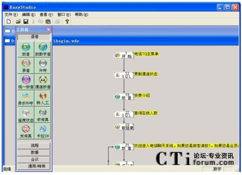 兩個集成環(huán)境,Easy Studio負責自動語音流程的編輯和調試,EasyAdmin負責對語音卡硬件的操作和按照EasyStudio生成的具體語音流程的實現(xiàn)。EasyCTI綜合實現(xiàn)了呼叫中心中IVR(Interactive