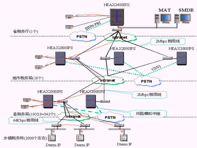 NEC公司為該省稅務(wù)提供了2003年全球同步推出的NEAX 2400及NEAX2000交換機(jī)系統(tǒng),為用戶提供了傳統(tǒng)時(shí)分交換系統(tǒng)和VoIP交換的完美結(jié)合,即具備VoIP功能又支持交換機(jī)的豐富功能,如豐富的終端,豐富的組網(wǎng)中繼和信令,語(yǔ)音信箱,多方會(huì)議,無(wú)線通信,統(tǒng)一計(jì)費(fèi)等等。