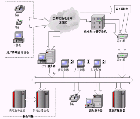(3)自動轉(zhuǎn)人工服務(wù)。系統(tǒng)還可自動轉(zhuǎn)接人工坐席,由電力專業(yè)人員負責(zé)解答和處理客戶意見。或者將客戶服務(wù)中心系統(tǒng)與后臺數(shù)據(jù)庫服務(wù)器相接,通過客戶提供的相關(guān)信息,為客戶提供個性化的在線服務(wù)。