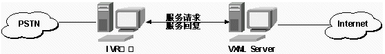在這里VXML是指Voice XML的服務(wù)器,它負(fù)責(zé)接收IVR轉(zhuǎn)發(fā)過來的用戶按鍵請求,并返回信息數(shù)據(jù)和操作指令。