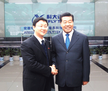 12月19日上午,中共中央政治局常委、全國政協(xié)主席賈慶林一行在安徽省委書記郭金龍、省長王金山等省市領導陪同下來到國家863計劃成果產業(yè)化基地——科大訊飛公司視察,賈慶林主席對科大訊飛在中文語音技術和產業(yè)化方面的成績給予充分肯定。上午8時30分,賈主席一行抵達訊飛語音產業(yè)大樓。中國科技大學黨委書記郭傳杰、科大訊飛總裁劉慶峰博士、基地總工陳濤及基地工作人員熱烈歡迎賈主席的到來。