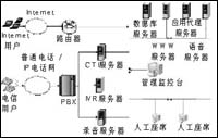 右圖是一個簡單的支持語音識別的多媒體呼叫中心結(jié)構(gòu)圖。這個呼叫中心既可以支持電話呼入,又可以支持Internet的呼入。如果是普通電話或是VoIP呼入,則先接通PBX交換機,然后連接到CTI和IVR服務(wù)器,而CTI、IVR和錄音服務(wù)器通過總線與其他的應(yīng)用服務(wù)器、人工座席和管理監(jiān)控臺相連;如果是Internet呼入,則直接可以通過Internet與各個應(yīng)用服務(wù)器或人工座席進行交互。