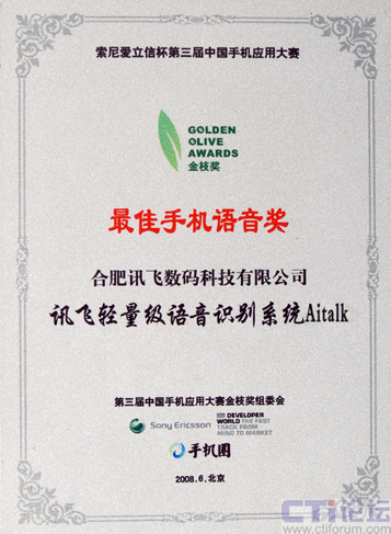 2008年6月26日,代表了中國手機(jī)應(yīng)用最高水平、最新發(fā)展的索尼愛立信杯第三屆中國手機(jī)應(yīng)用大賽金枝獎頒獎典禮在北京隆重舉行,科大訊飛全資子公司——訊飛數(shù)碼提交的參賽產(chǎn)品,輕量級語音識別系統(tǒng)Aitalk,榮獲本屆大賽 “最佳手機(jī)語音金枝獎”。這是科大訊飛既在本賽事首屆、第二屆獲此殊榮后,連續(xù)第三年奪得該獎項,充分體現(xiàn)了科大訊飛在手機(jī)語音應(yīng)用領(lǐng)域具備的超群實力和絕對的領(lǐng)先地位。
