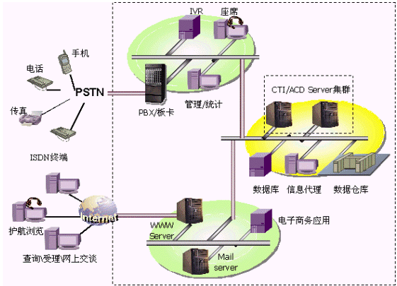 將PSTN訪問、Internet訪問有機(jī)結(jié)合,對(duì)傳統(tǒng)呼叫中心進(jìn)行擴(kuò)充,支持多種接入方式,多種交流渠道,具有傳統(tǒng)呼叫中心無(wú)法比擬的優(yōu)越性。