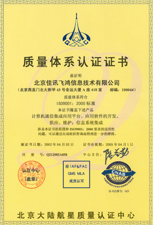 經(jīng)過近半年時(shí)間的建立和保持質(zhì)量體系運(yùn)行,佳訊飛鴻于在2002年3月順利的通過為期三天的嚴(yán)格審核,并重點(diǎn)對佳訊公司核心技術(shù)的CTI平臺進(jìn)行審核。2002年4月2日通過了ISO國際組織的新體系標(biāo)準(zhǔn)ISO9001:2000的體系認(rèn)證,取得了通過該標(biāo)準(zhǔn)的認(rèn)證證書。佳訊飛鴻公司也成為國內(nèi)第一家對CTI平臺進(jìn)行審核并通過認(rèn)證的公司。其完成標(biāo)志著公司從成立之時(shí)起即嚴(yán)格遵循國際企業(yè)標(biāo)準(zhǔn)及現(xiàn)代企業(yè)管理模式,以軟件產(chǎn)品質(zhì)量管理體系為載體,以客戶需求為導(dǎo)向。全面提高產(chǎn)品、服務(wù)質(zhì)量,順應(yīng)不斷變化的技術(shù)發(fā)展方向和市場變化,在質(zhì)量、技術(shù)、成本和交期等方面全力滿足客戶需求,為客戶提供最佳性價(jià)比的產(chǎn)品和服務(wù)。